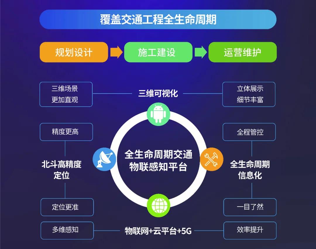 平臺基于北斗+三維+物聯(lián)網(wǎng)+云平臺等技術(shù),建立全生命周期的精細動態(tài)管理系統(tǒng),針對工程規(guī)劃設(shè)計、工程施工建設(shè)、工程運營維護三個階段,提供三維可視化的交通物聯(lián)感知服務,有效提升交通工程全生命周期的管控效率和水平。