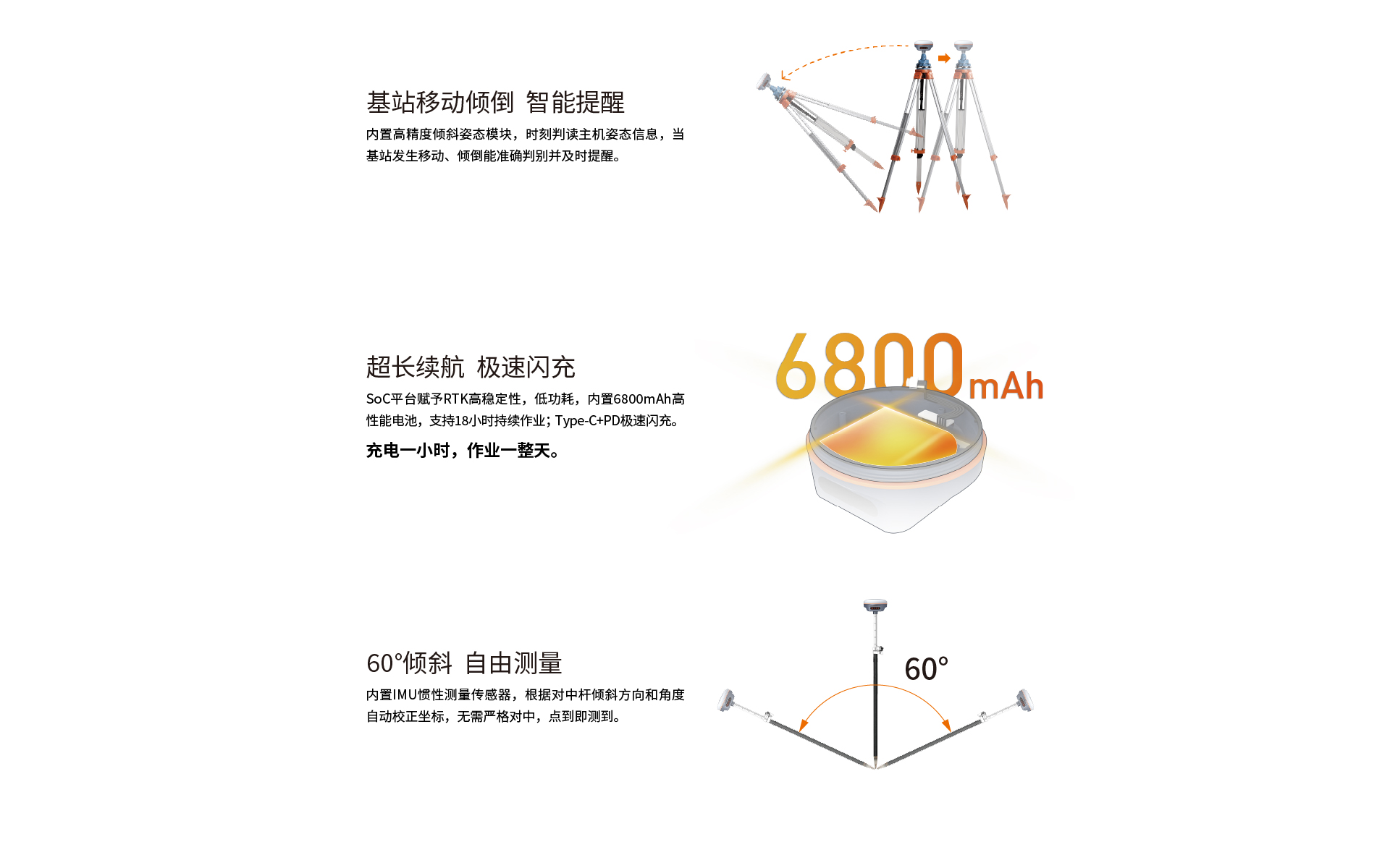 慣導傾斜測量 | 內置IMU慣性測量傳感器,支持慣導傾斜測量功能,根據(jù)對中桿傾斜方向和角度自動校正坐標。 |