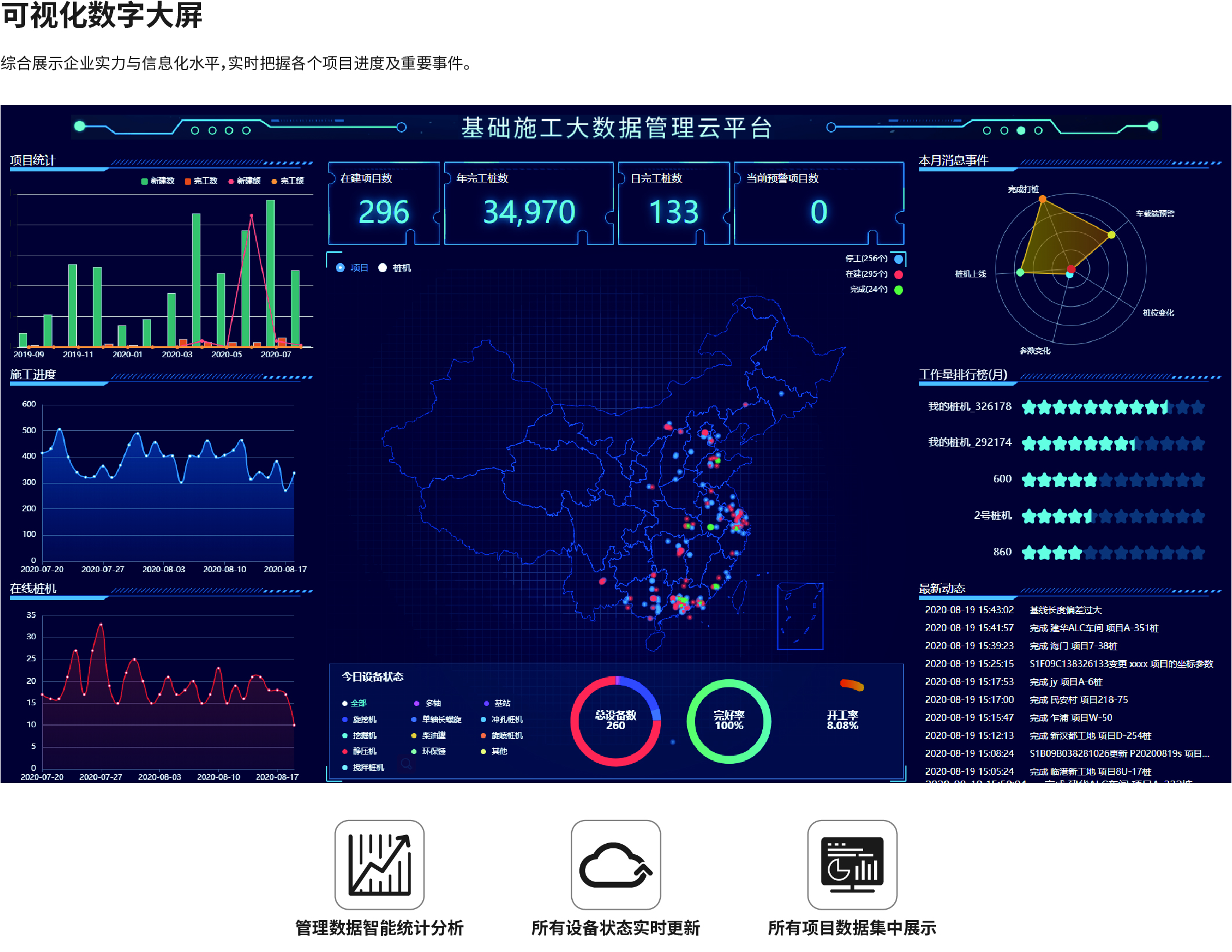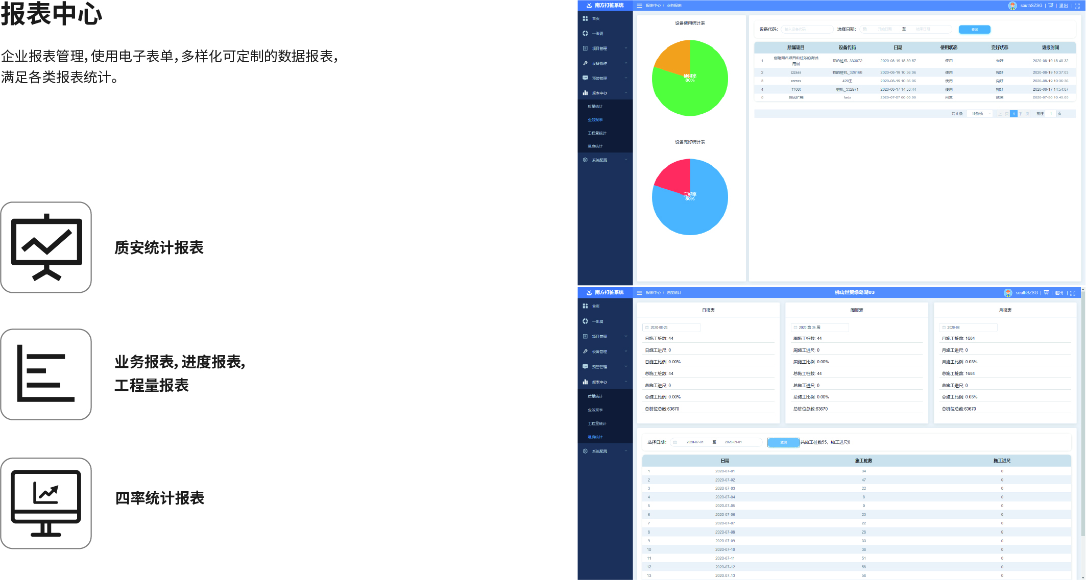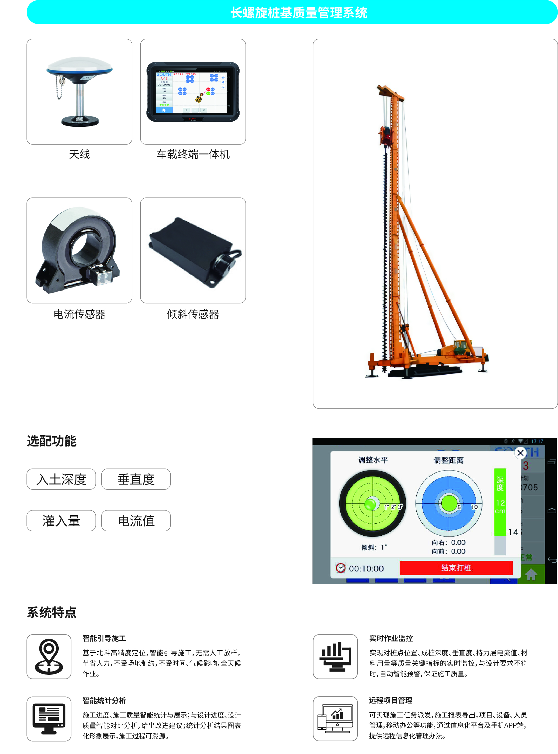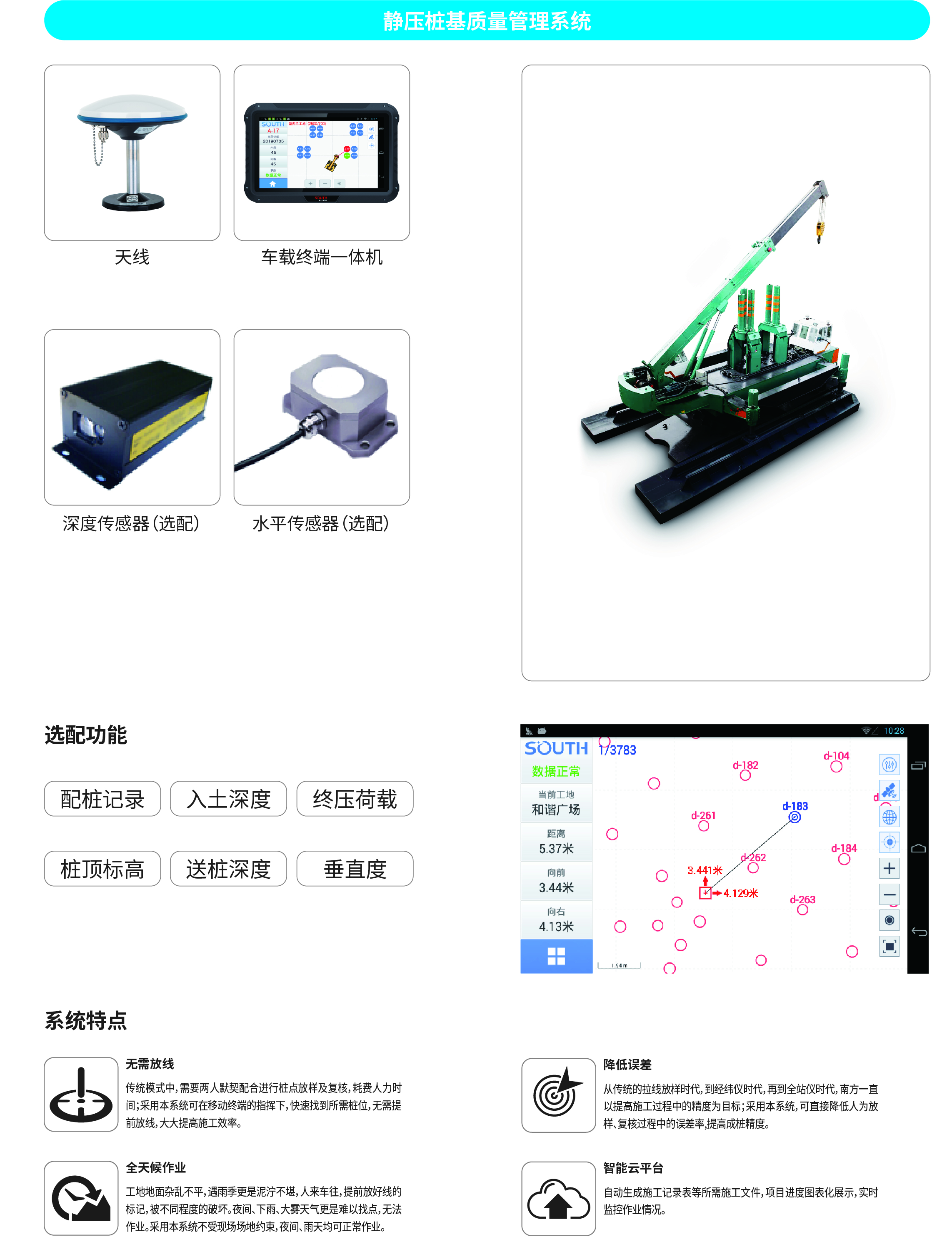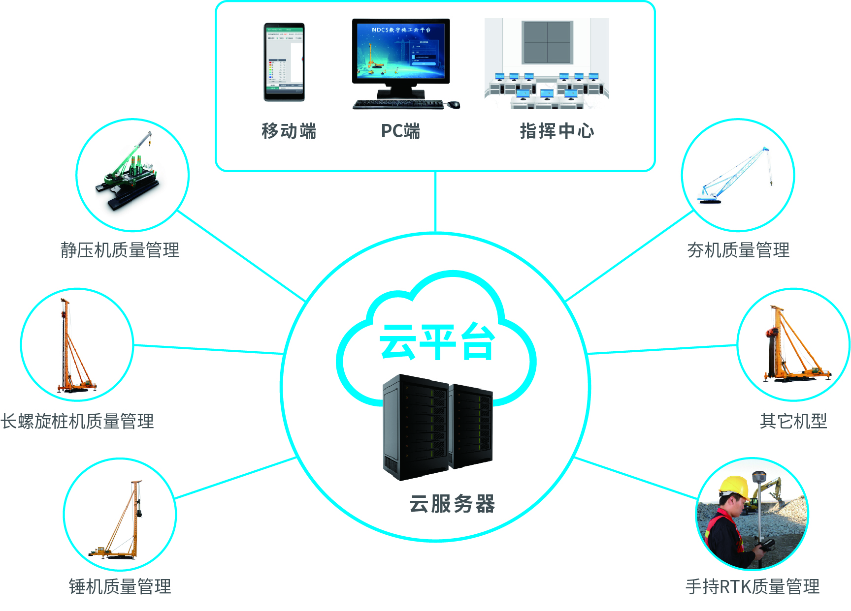 南方NDCS數(shù)字化施工云平臺是依托物聯(lián)網(wǎng)、互聯(lián)網(wǎng)建立的大數(shù)據(jù)管理平臺。平臺以“互聯(lián)網(wǎng)+”為理念,實(shí)現(xiàn)了地基處理施工全過程信息化、數(shù)字化、智能化和可視化,為靜壓樁機(jī)、液壓錘、柴油錘、長螺旋、旋挖機(jī)、多軸樁機(jī)等多類基礎(chǔ)機(jī)械在施工質(zhì)量管理方面提供整套優(yōu)質(zhì)的綜合解決辦法。平臺可實(shí)現(xiàn)對施工進(jìn)度、施工質(zhì)量、施工設(shè)備的信息化管理以及智能統(tǒng)計(jì)、智能預(yù)警、智能化施工等功能,并配備“施工云管家”APP端,實(shí)現(xiàn)遠(yuǎn)程化項(xiàng)目多設(shè)備管理,讓用戶能實(shí)時遠(yuǎn)程把控現(xiàn)場施工進(jìn)度、質(zhì)量,高效管理調(diào)度自有及租賃設(shè)備,有效加強(qiáng)項(xiàng)目風(fēng)險管控與目標(biāo)執(zhí)行。