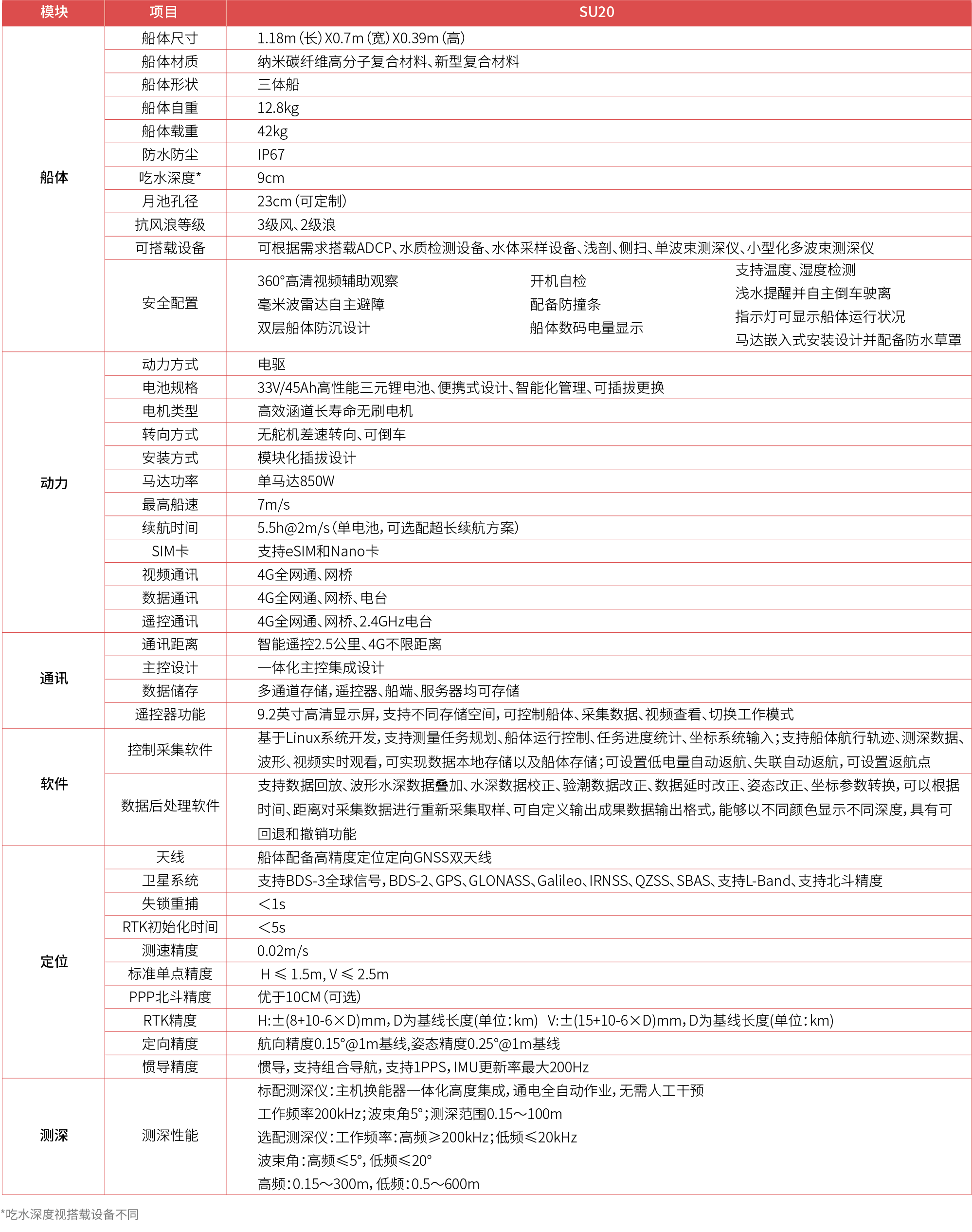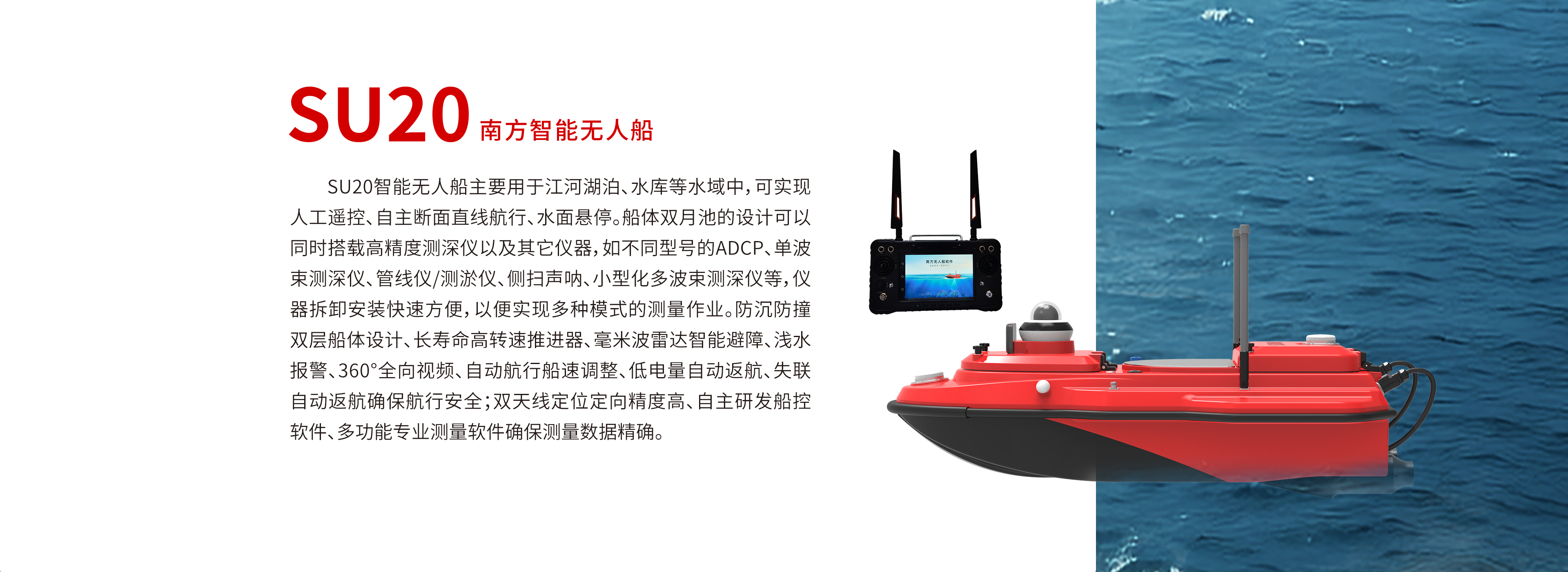 SU20智能無人船主要用于江河湖泊、水庫等水域中,可實(shí)現(xiàn)人工遙控、自主斷面直線航行、水面懸停。船體雙月池的設(shè)計(jì)可以同時(shí)搭載高精度測深儀以及其它儀器,如不同型號(hào)的ADCP、單波束測深儀、管線儀/測淤儀、側(cè)掃聲吶、小型化多波束測深儀等,儀器拆卸安裝快速方便,以便實(shí)現(xiàn)多種模式的測量作業(yè)。防沉防撞雙層船體設(shè)計(jì)、長壽命高轉(zhuǎn)速推進(jìn)器、毫米波雷達(dá)智能避障、淺水報(bào)警、360°全向視頻、自動(dòng)航行船速調(diào)整、低電量自動(dòng)返航、失聯(lián)自動(dòng)返航確保航行安全;雙天線定位定向精度高、自主研發(fā)船控軟件、多功能專業(yè)測量軟件確保測量數(shù)據(jù)精確。