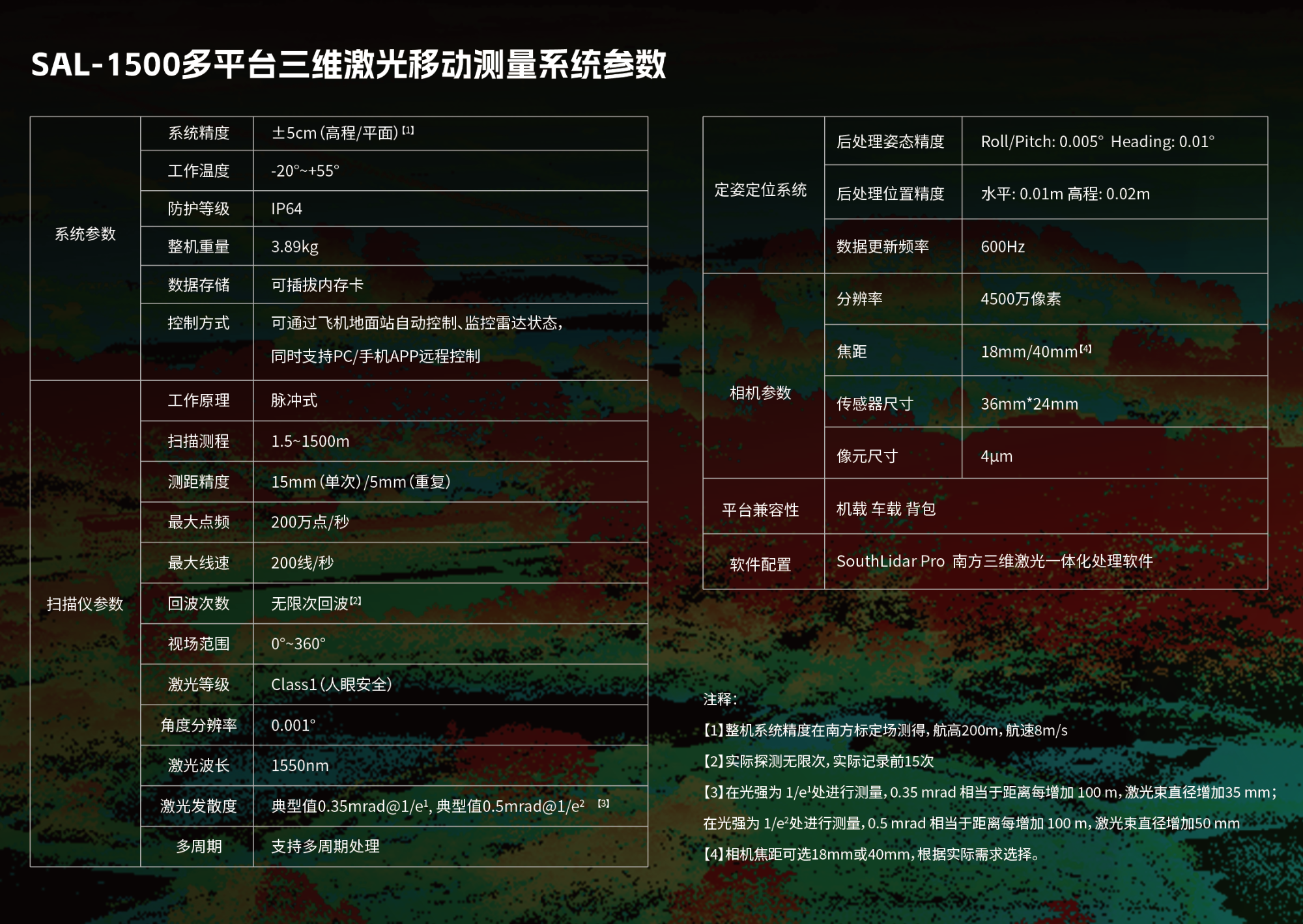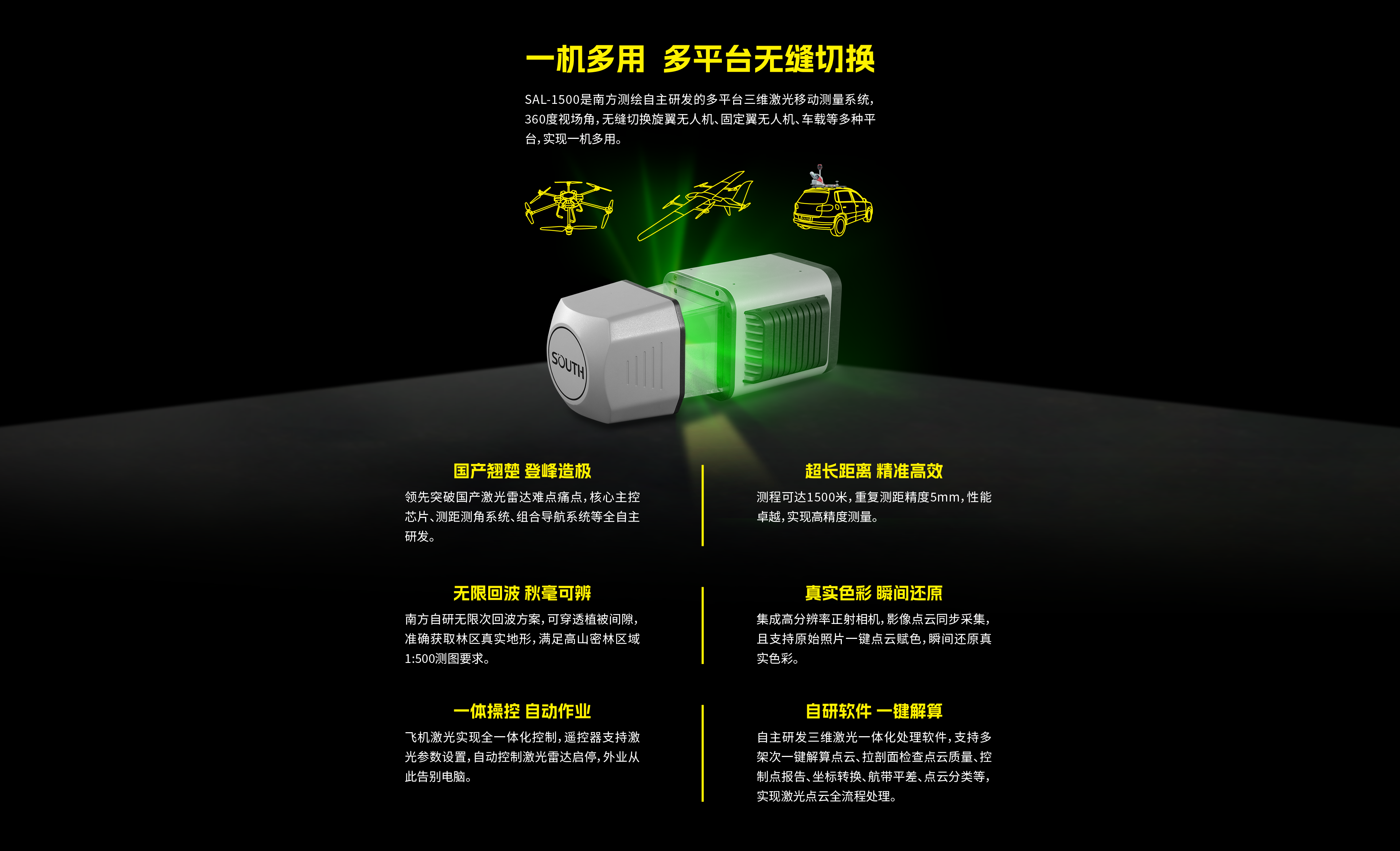 SAL-1500是南方測(cè)繪自主研發(fā)的多平臺(tái)三維激光移動(dòng)測(cè)量系統(tǒng),360度視場(chǎng)角,無縫切換旋翼無人機(jī)、固定翼無人機(jī)、車載等多種平臺(tái),實(shí)現(xiàn)一機(jī)多用。